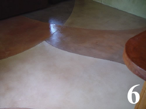 1/4" thick cementious overlay, chemical stained with saw cut graphics.