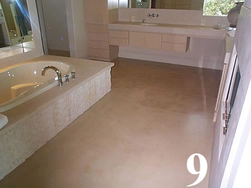 Galleries1" thick concrete overlay, color hardened, penetrating stain and polished with saw cut scores at 2' O.C. grouted light oak wood inlays. Installed over an existing concrete floor.