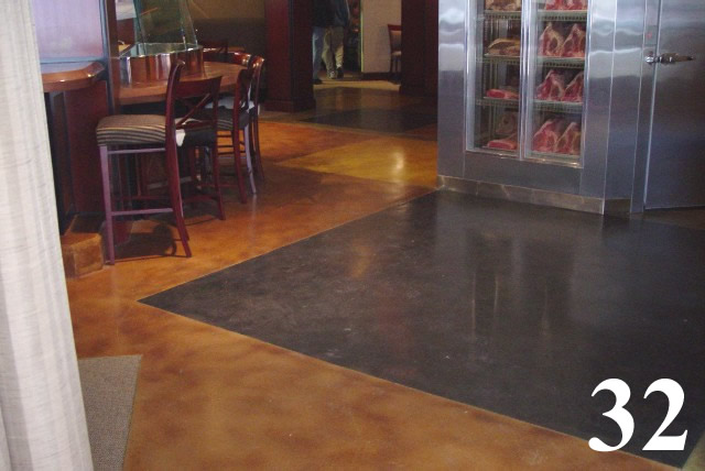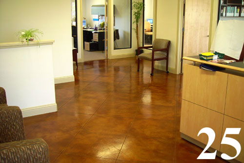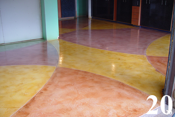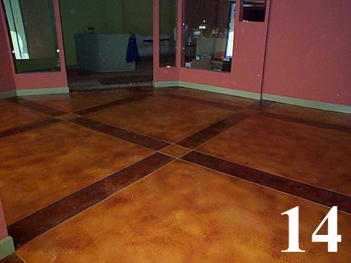 Multi color chemical stained floors with saw cut scores over existing concrete slab.