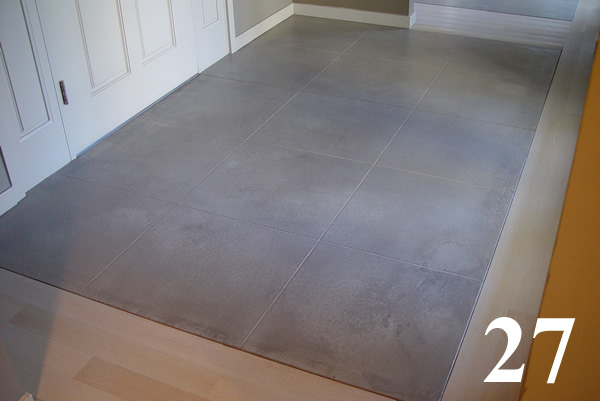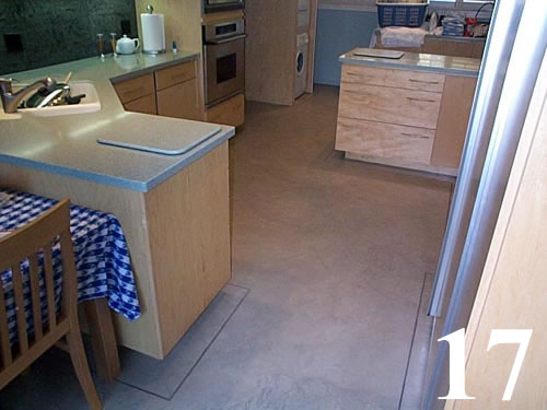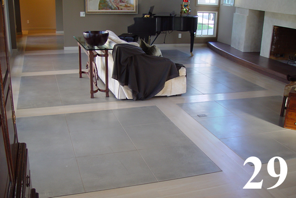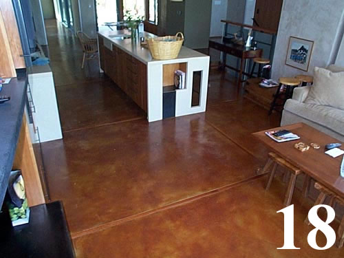 Galleries3" thick concrete topping over wood subfloors and radiant heat with oak inlays. Common gray concrete, chemically stained and sealed.