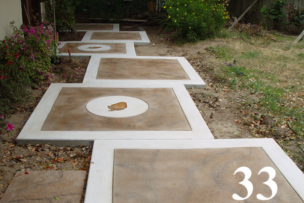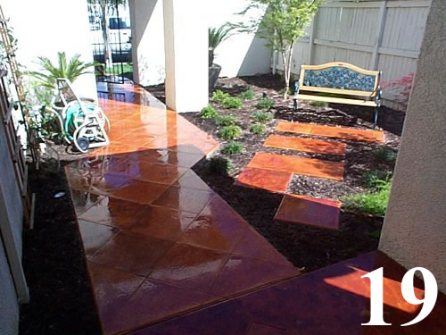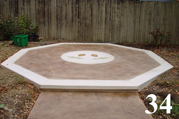 Cast in place color hardened, stained and sealed patio with custom engraved logo at the center and grouted joints.