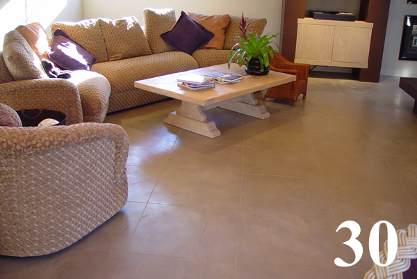 Micro finish with custom saw cut scores grouted over existing concrete floor. 1/8" thick max.