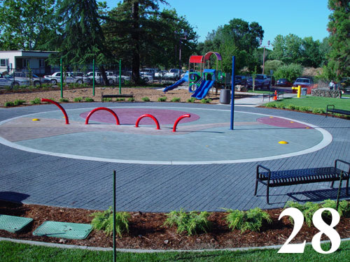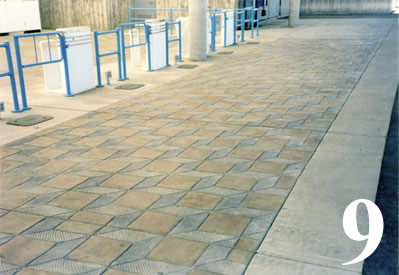 Water play area: Color hardened concrete with 4"x4" granite set pattern.