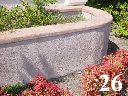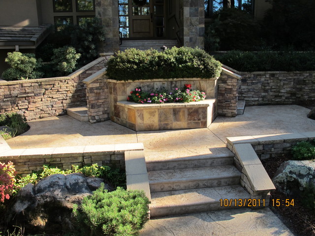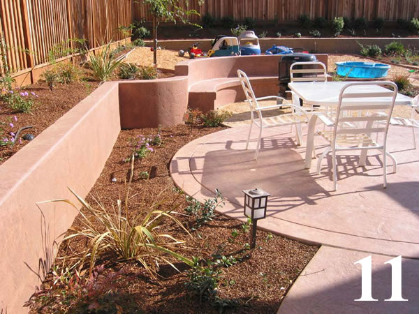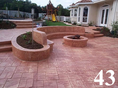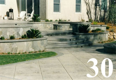 Deep slate texture patio and walks, textured planter walls and bench seat to match patio.