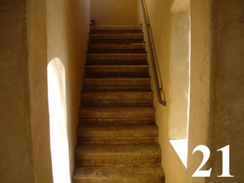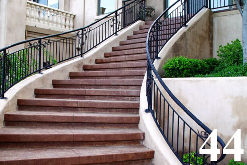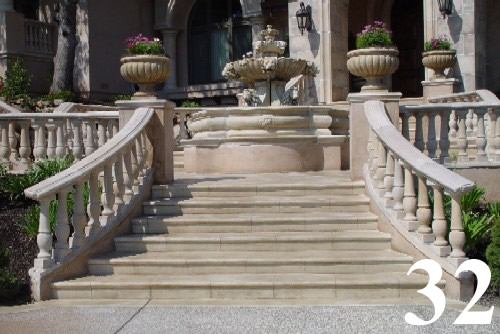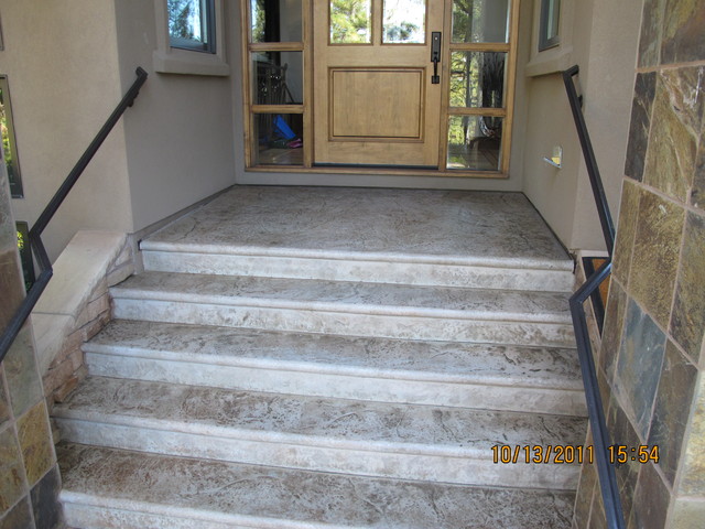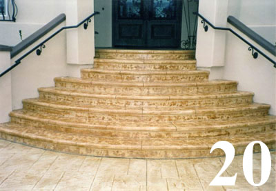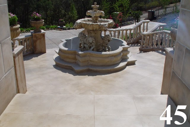 Travertine finish entry to match travertine inside of home and pre cast fountain. Intermediate cantilever steps, saw cut scores at 24" O.C. grouted. Polish finish, stained with Apex penetrating stain & seal process.