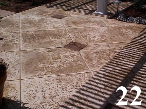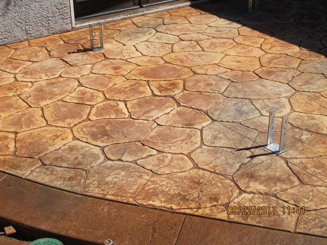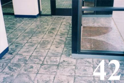 Ashlar slate pattern with semi precious aggregate added to color hardener, sand blasted then stained and sealed.