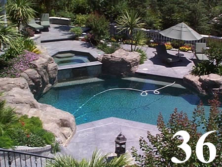 Ashlar slate pool deck and patio terraces with slate textured bench seat and planter walls to match.