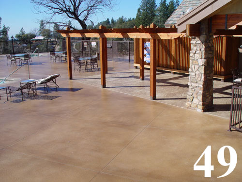 Slate textured commercial pool coping with salt textured pool deck, color hardened and stained with Apex penetrating stain and seal. Finished off with SB seal with shark grip added for increased slip resistance.