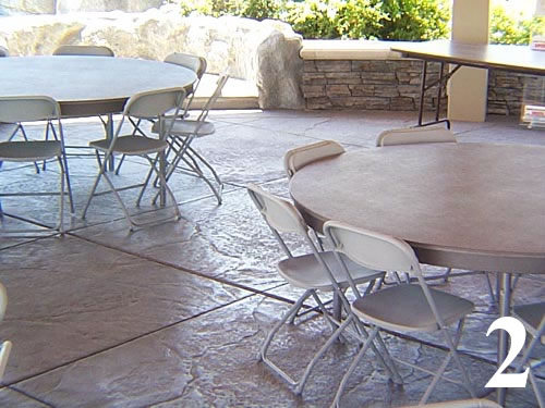 Ashlar slate pattern with semi precious aggregate added to color hardener, sand blasted then stained and sealed.